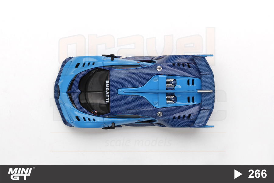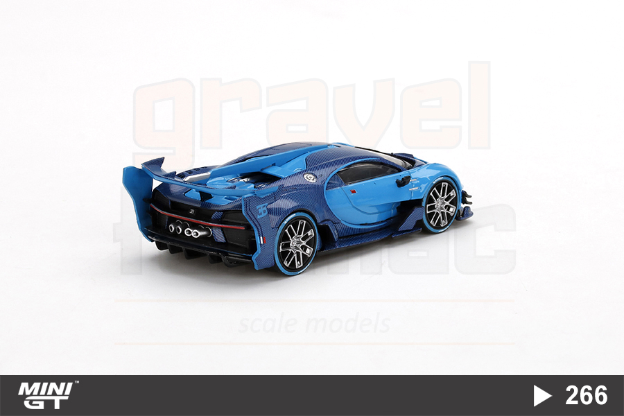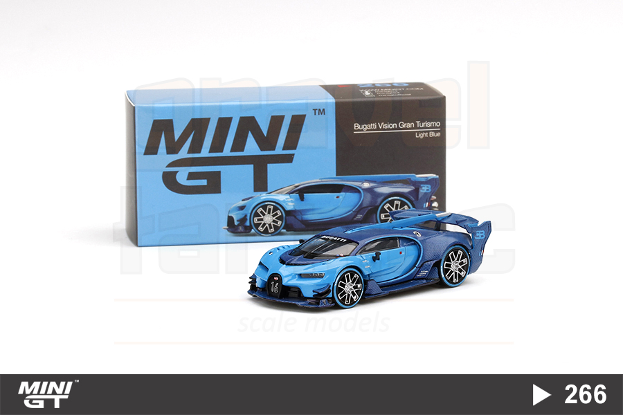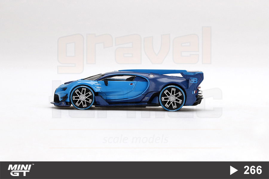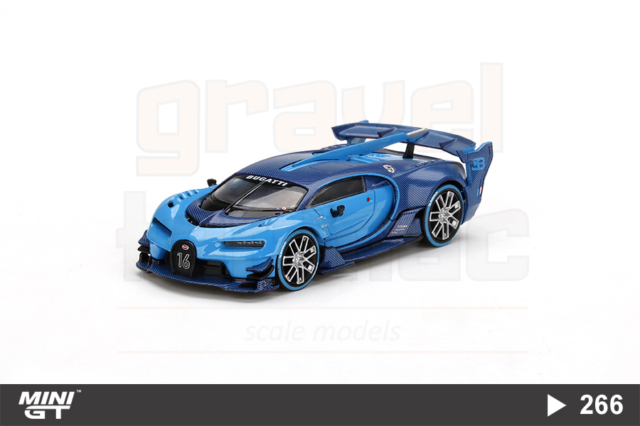 Dünyaca ünlü supersport otomobil üreticisi Bugatti’nin Vision Gran Turismo aracının 1/64 ölçekli Mini GT üretimi MGT00266 numaralı modeli.