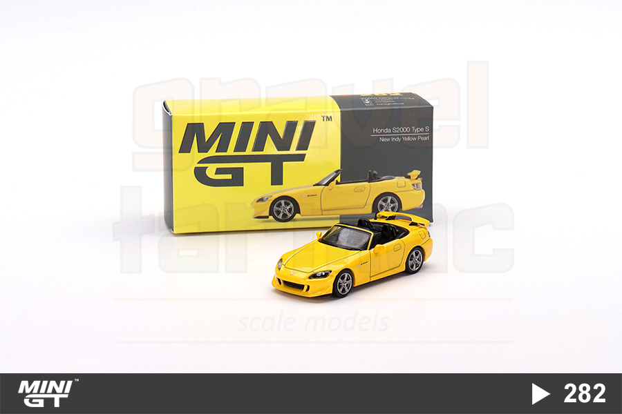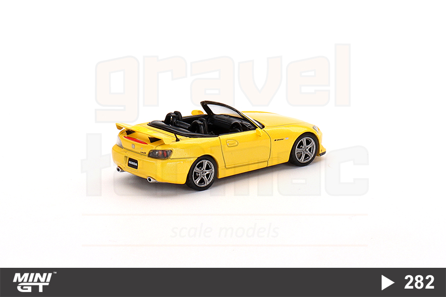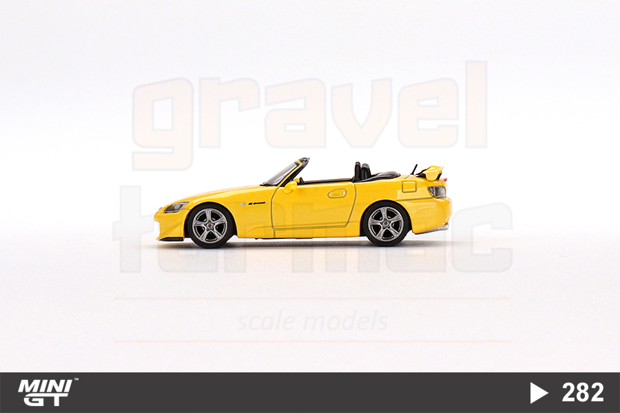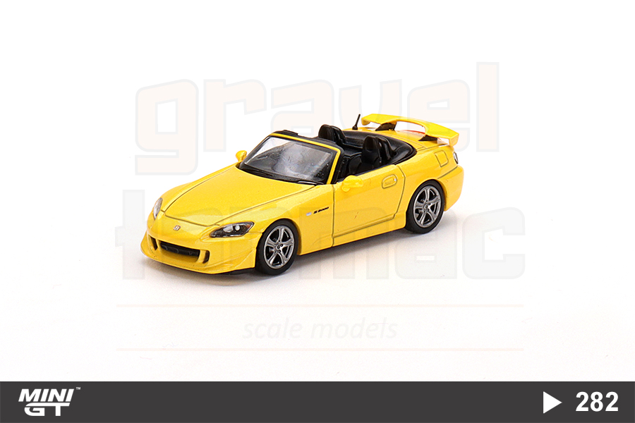 Sarı renkli Honda S2000 Type S versiyonu üzeri açık halinin 1/64 ölçekli Mini GT üretimi sağdan direksiyonlu MGT00282 numaralı modeli.