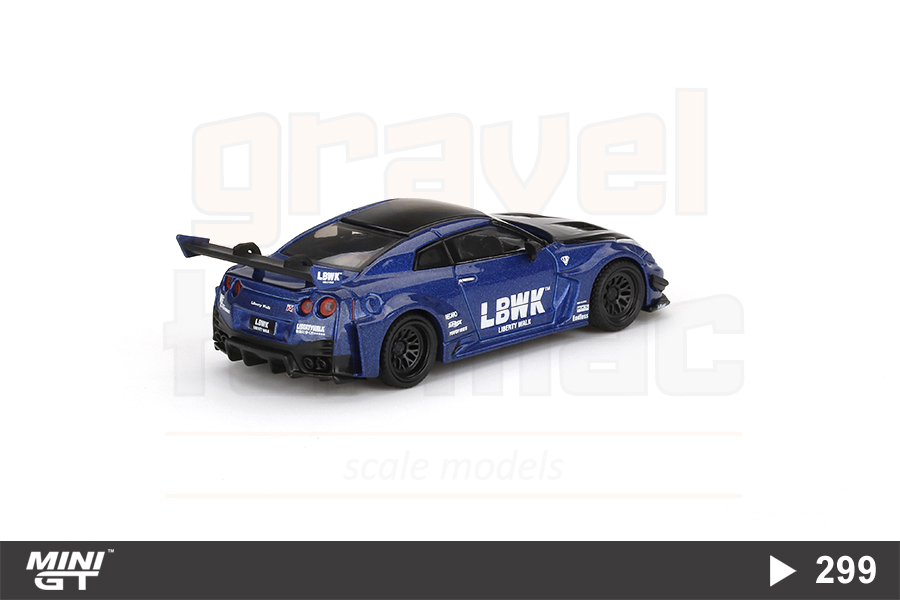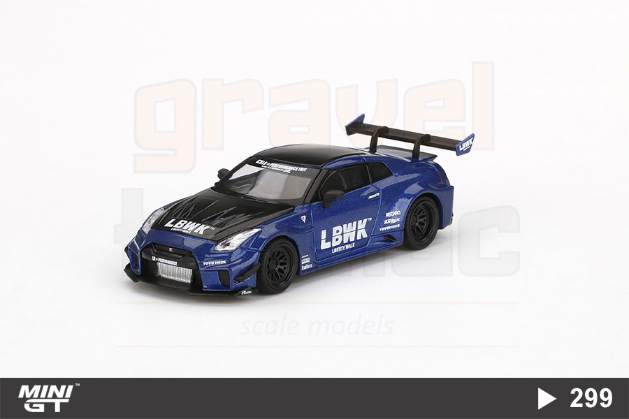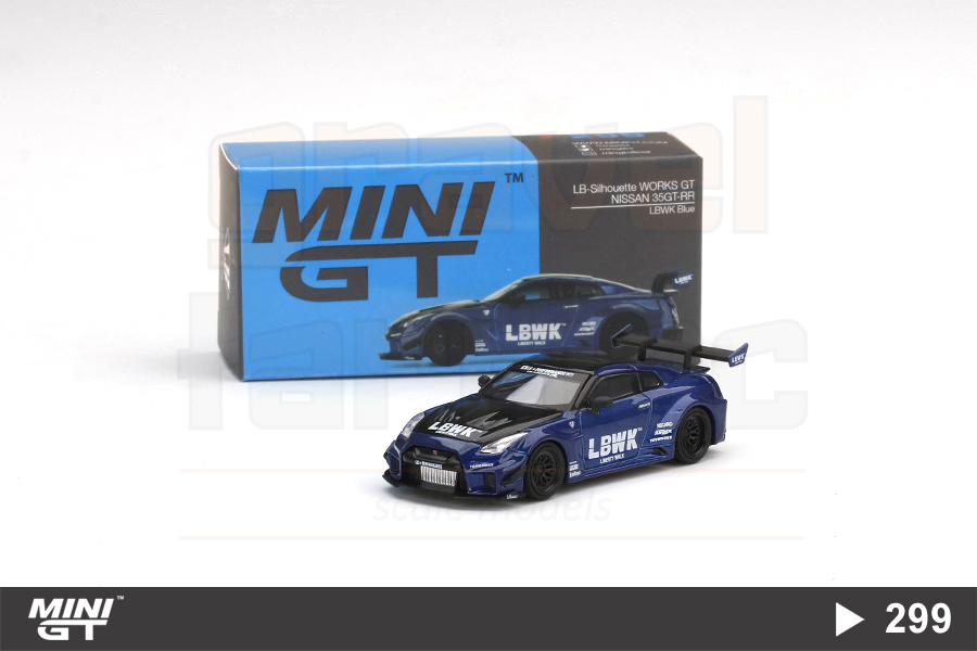 Ünlü Japon otomobil modifiye şirketi Liberty Walk tarafından hazırlanan LB-Silhouette Works GT Nissan 35GT-RR Ver.2 aracın 1/64 ölçekli Mini GT üretimi MGT00299 numaralı modeli.