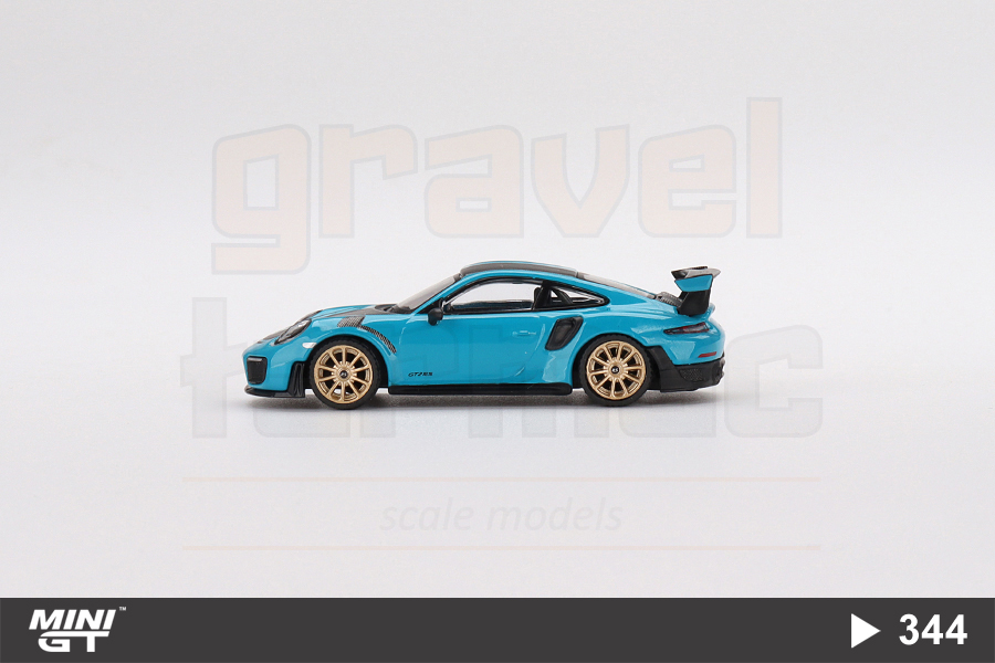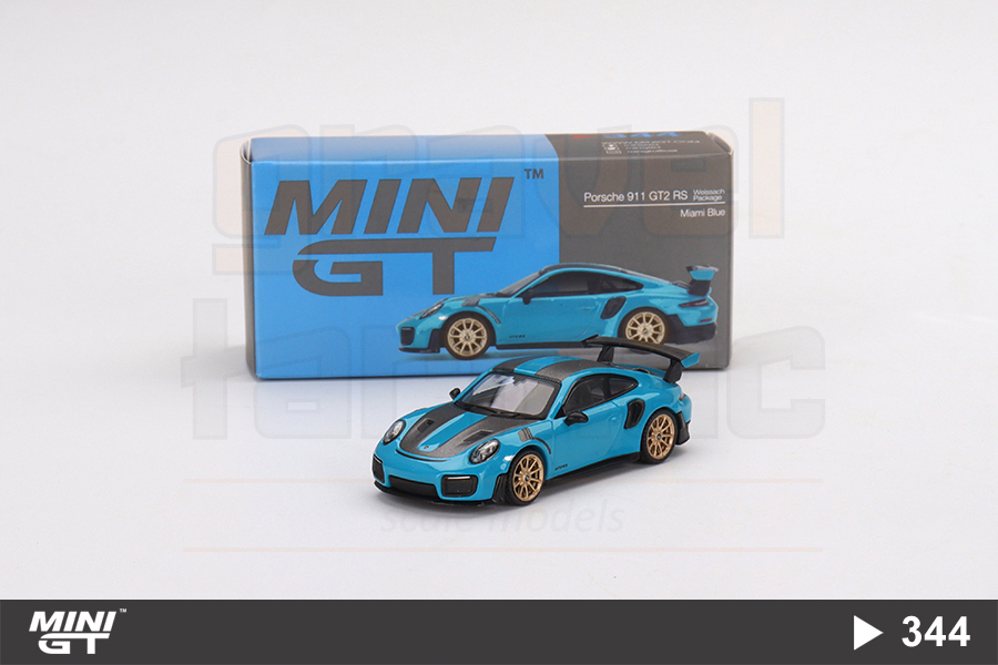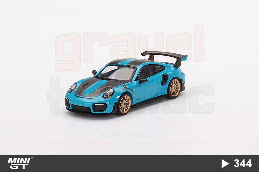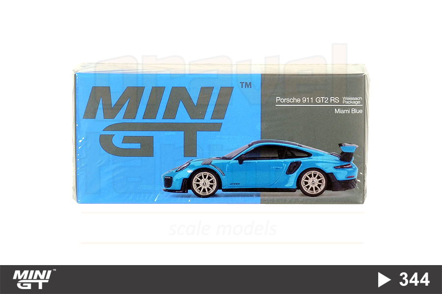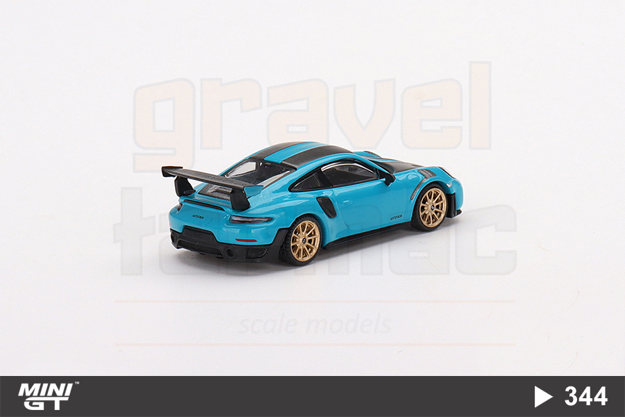 Miami blue renkli Porsche 911 GT2 RS’in Weissach paketli versiyonunun 1/64 ölçekli Mini GT üretimi MGT00344 numaralı modeli.